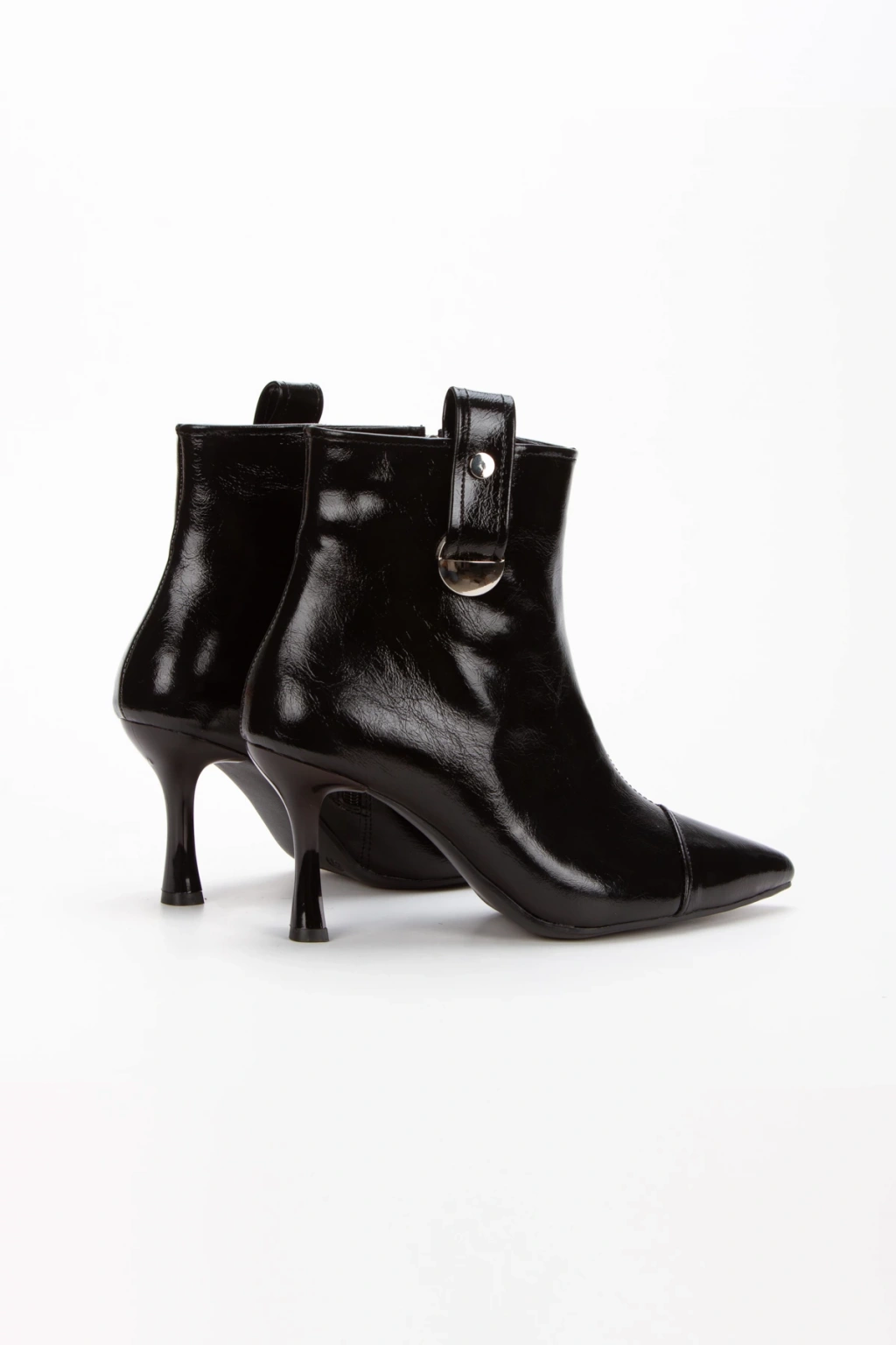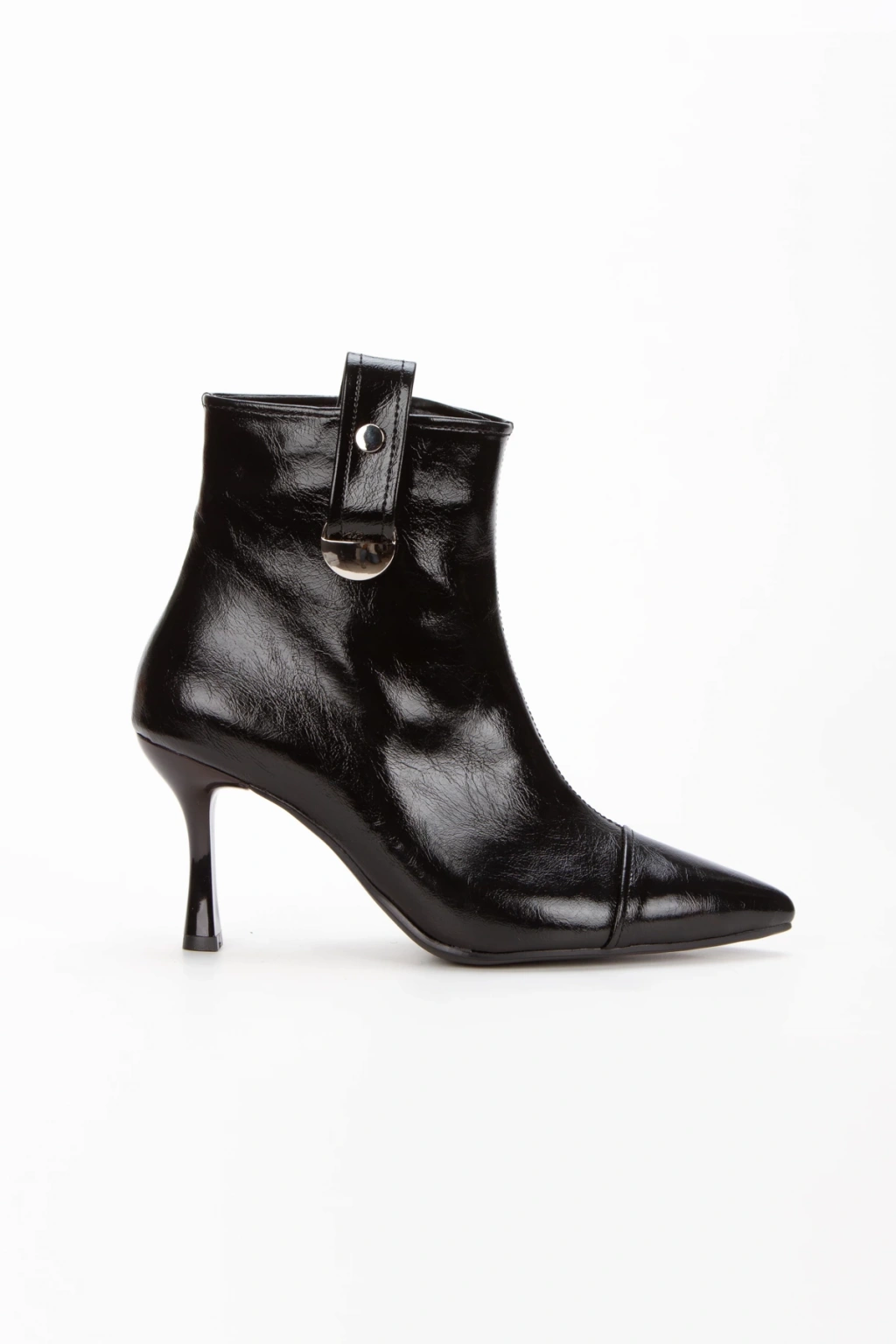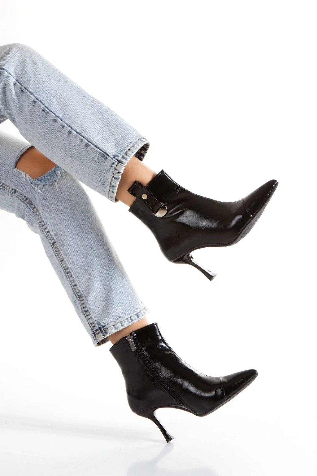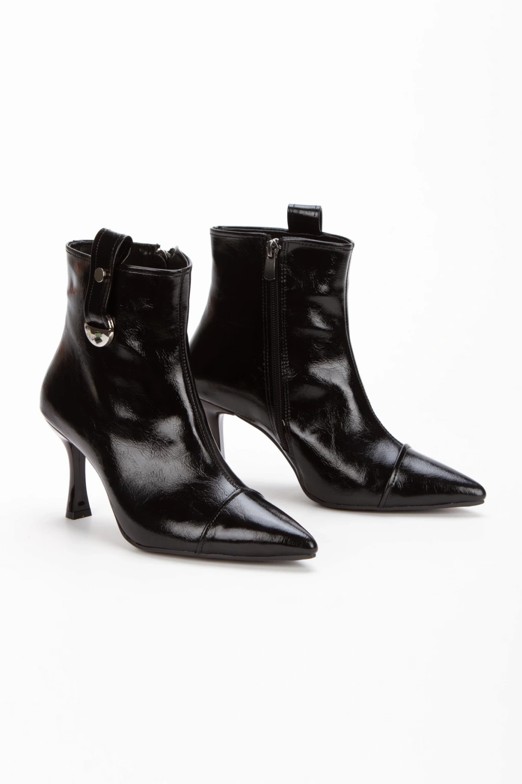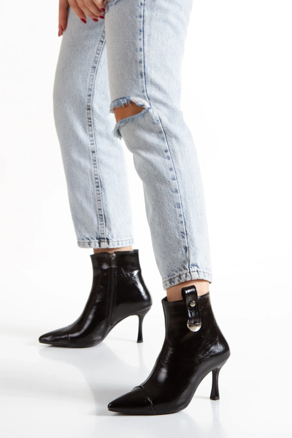 Siyah Hakiki Deri Görünümlü Sivri Burunlu İnce Topuklu Tokalı Bot