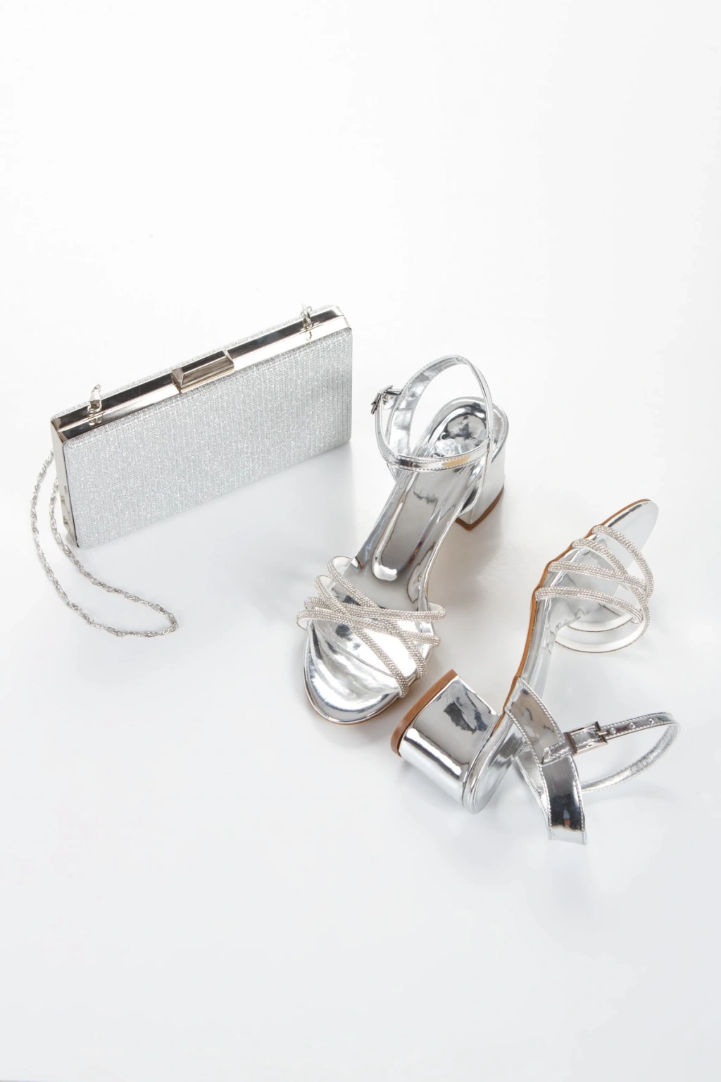 Gümüş Taşlı Özel Davetlere Uygun Şık İnce Topuklu Ayakkabı ve Çanta Takımı
