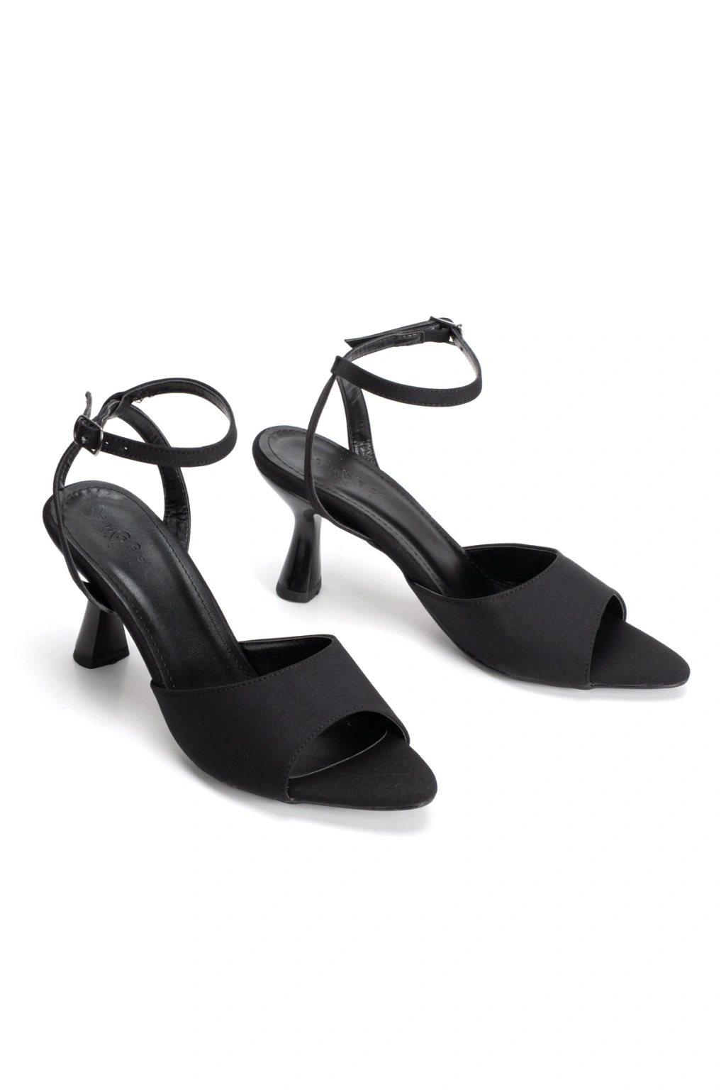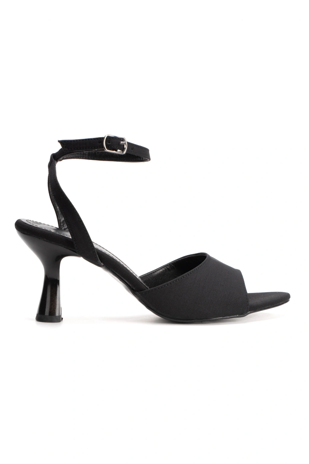 Siyah Kadın İnce Bantlı Bilekten Bağlamalı Kısa Topuklu Ayakkabı