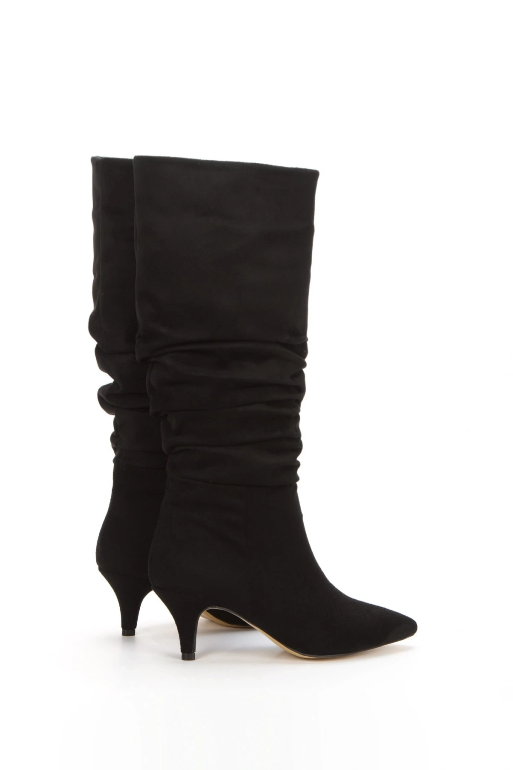 Kadın Siyah Süet Büzgü Detaylı İnce Topuklu Dizaltı Çizme