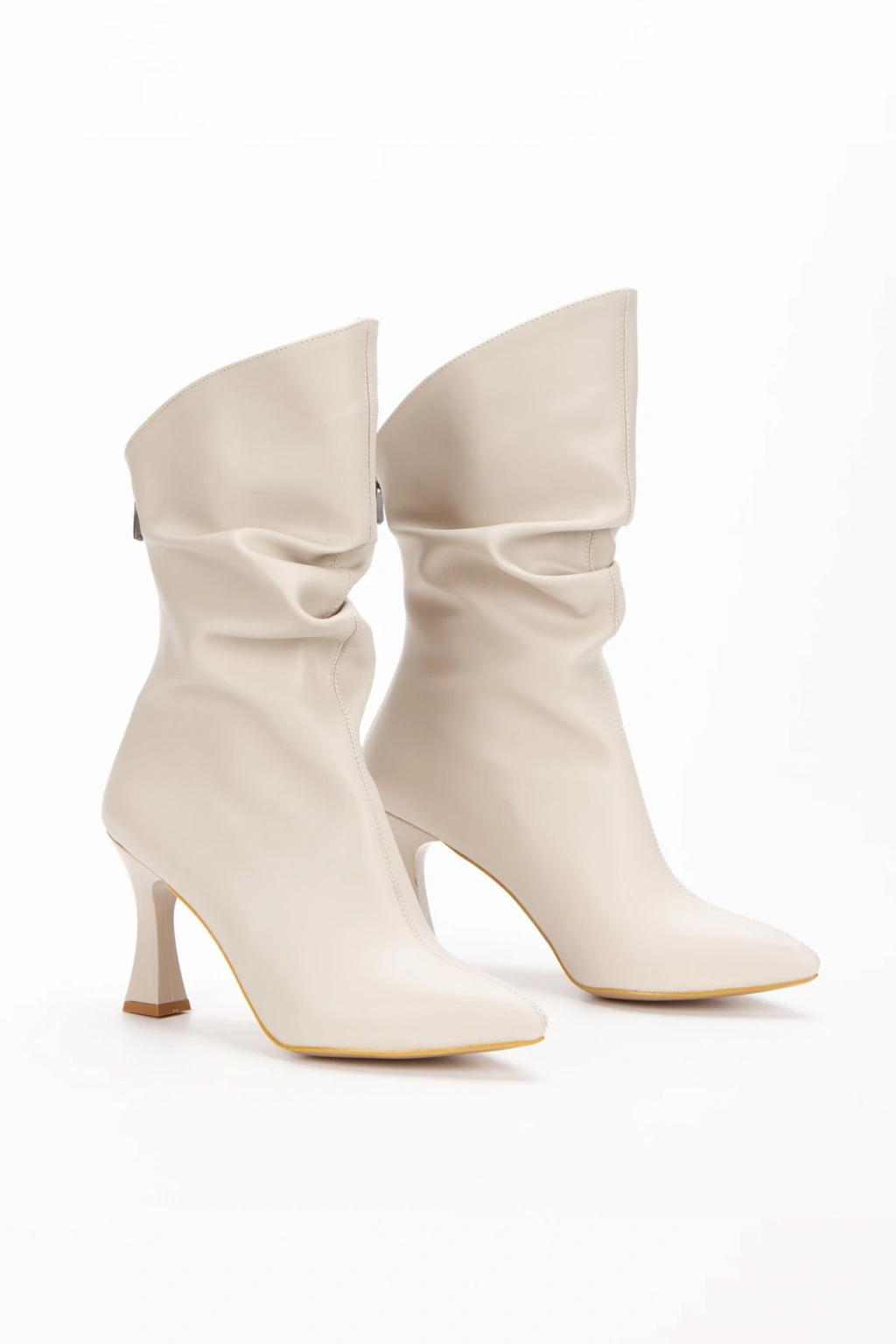 Kadın Bej Özel Tasarım İnce Topuklu Büzgülü Fermuarlı Bot