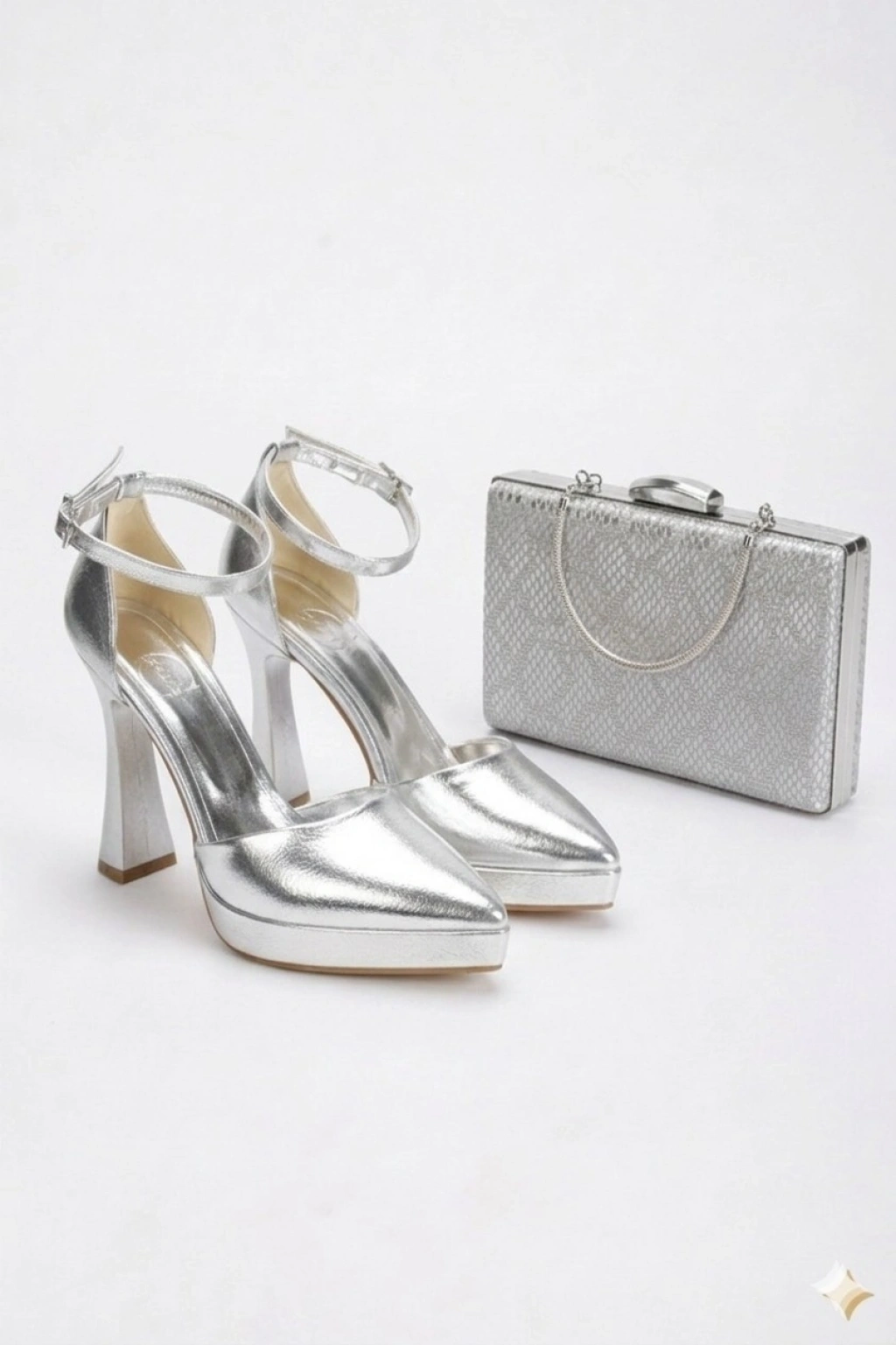 Kadın Gümüş Sivri Burunlu Platform Topuklu Abiye Ayakkabı ve Çanta Takımı