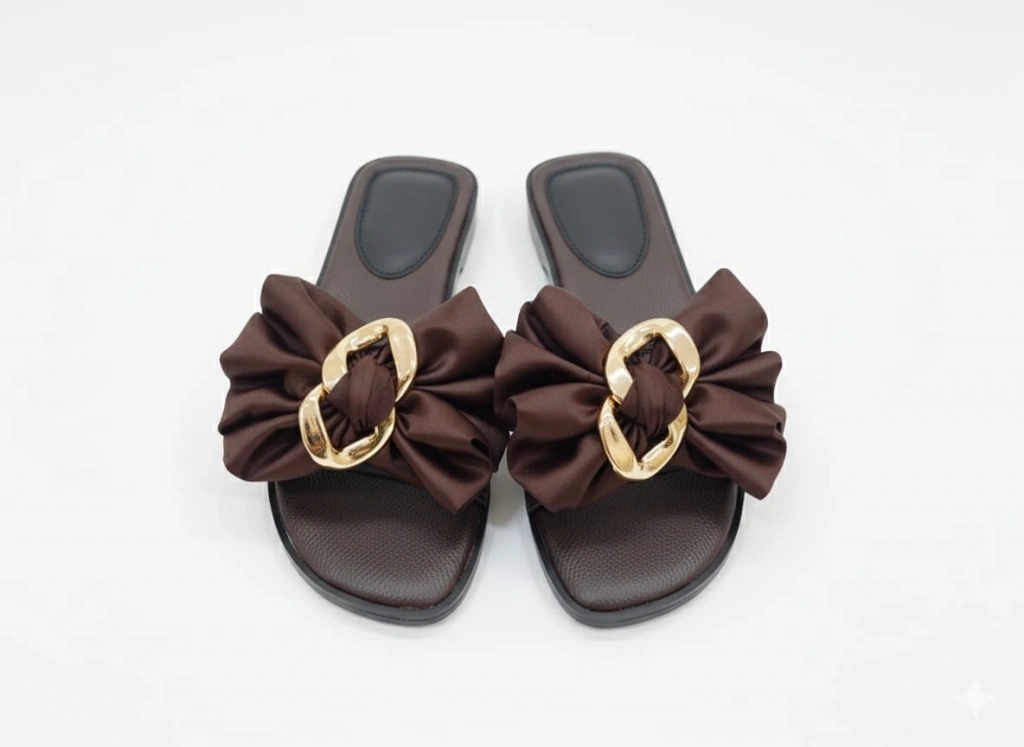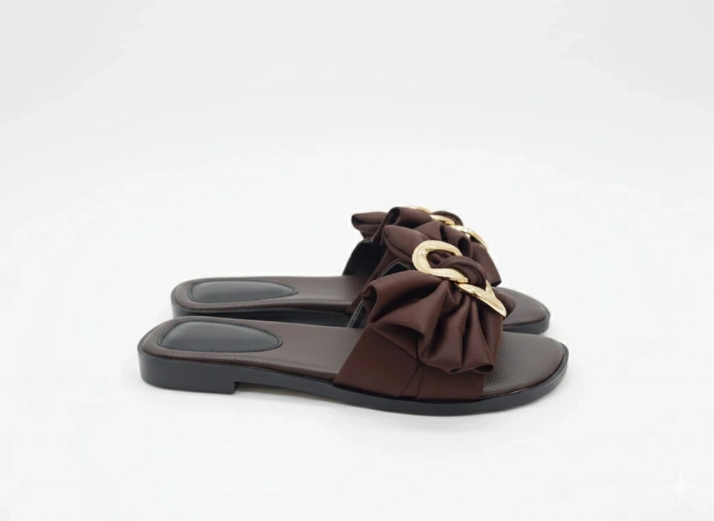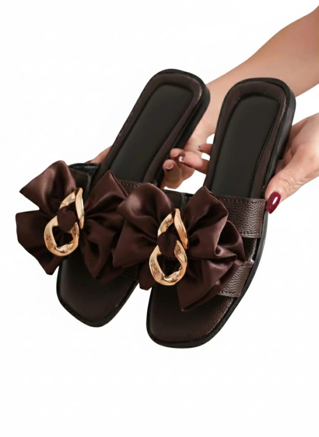 Kadın Kahverengi Fiyonklu Altın Tokalı Terlik