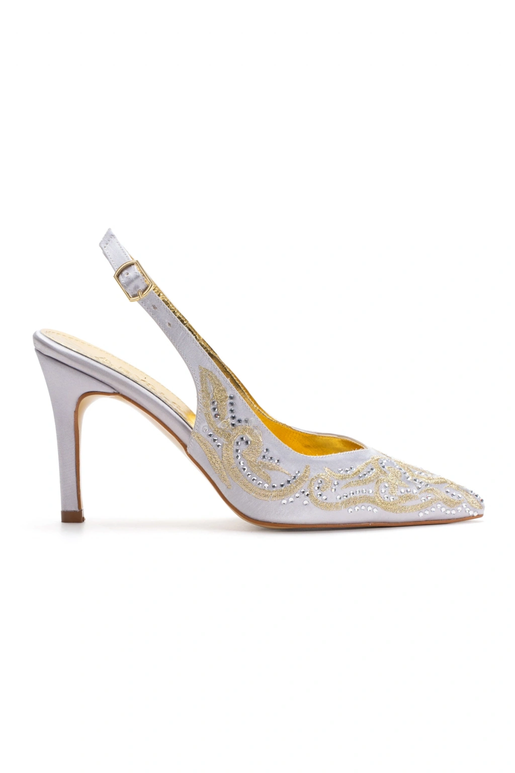 Kadın Gümüş Taşlı ve Nakışlı Şeffaf Görünümlü Sivri Burun Davet Ayakkabısı
