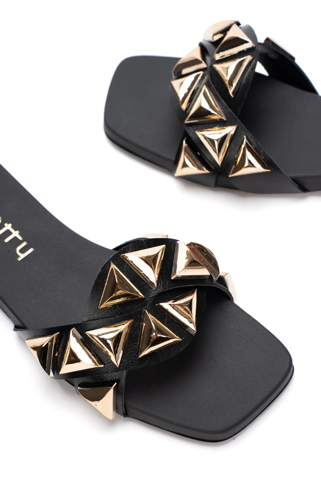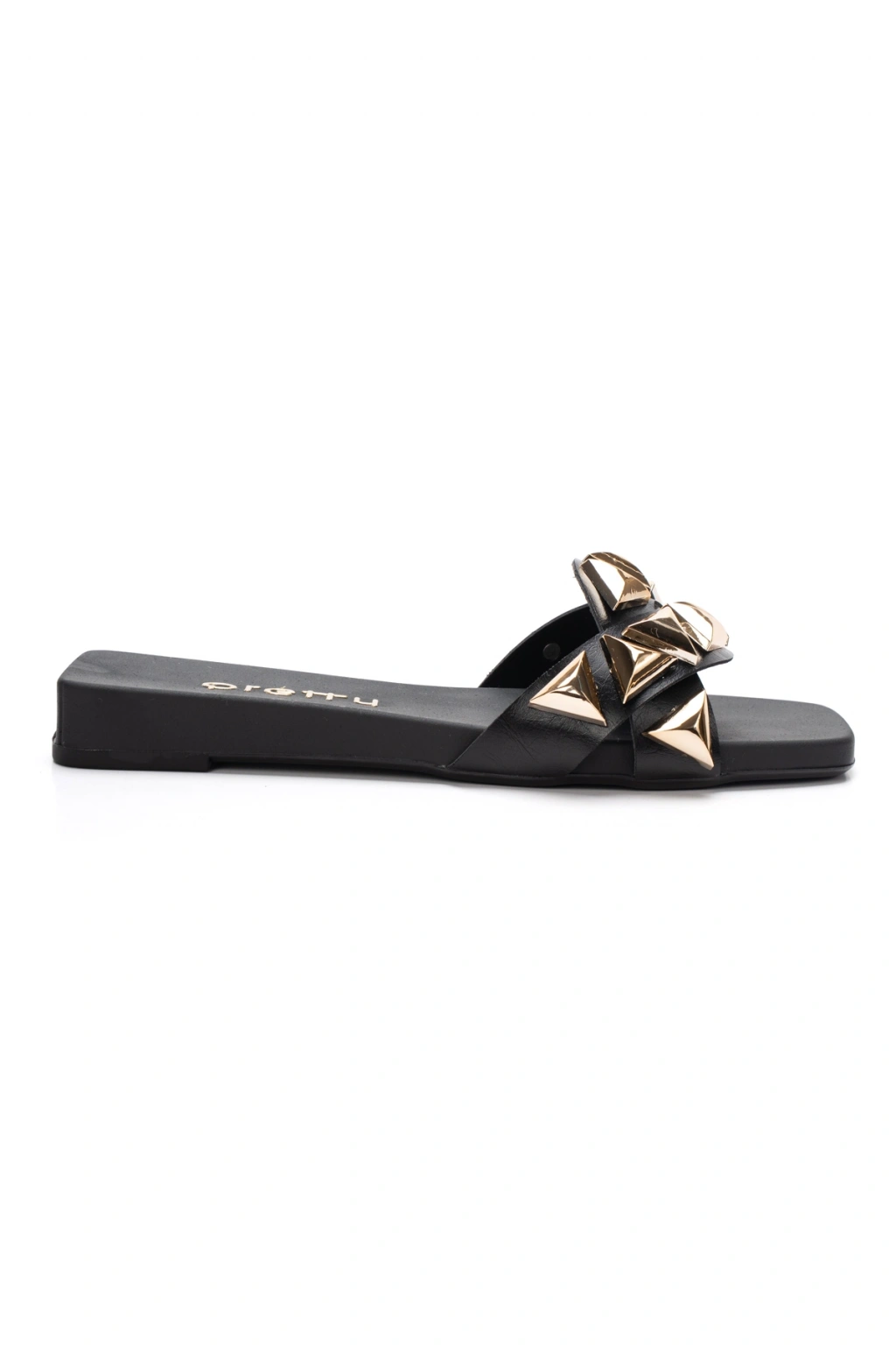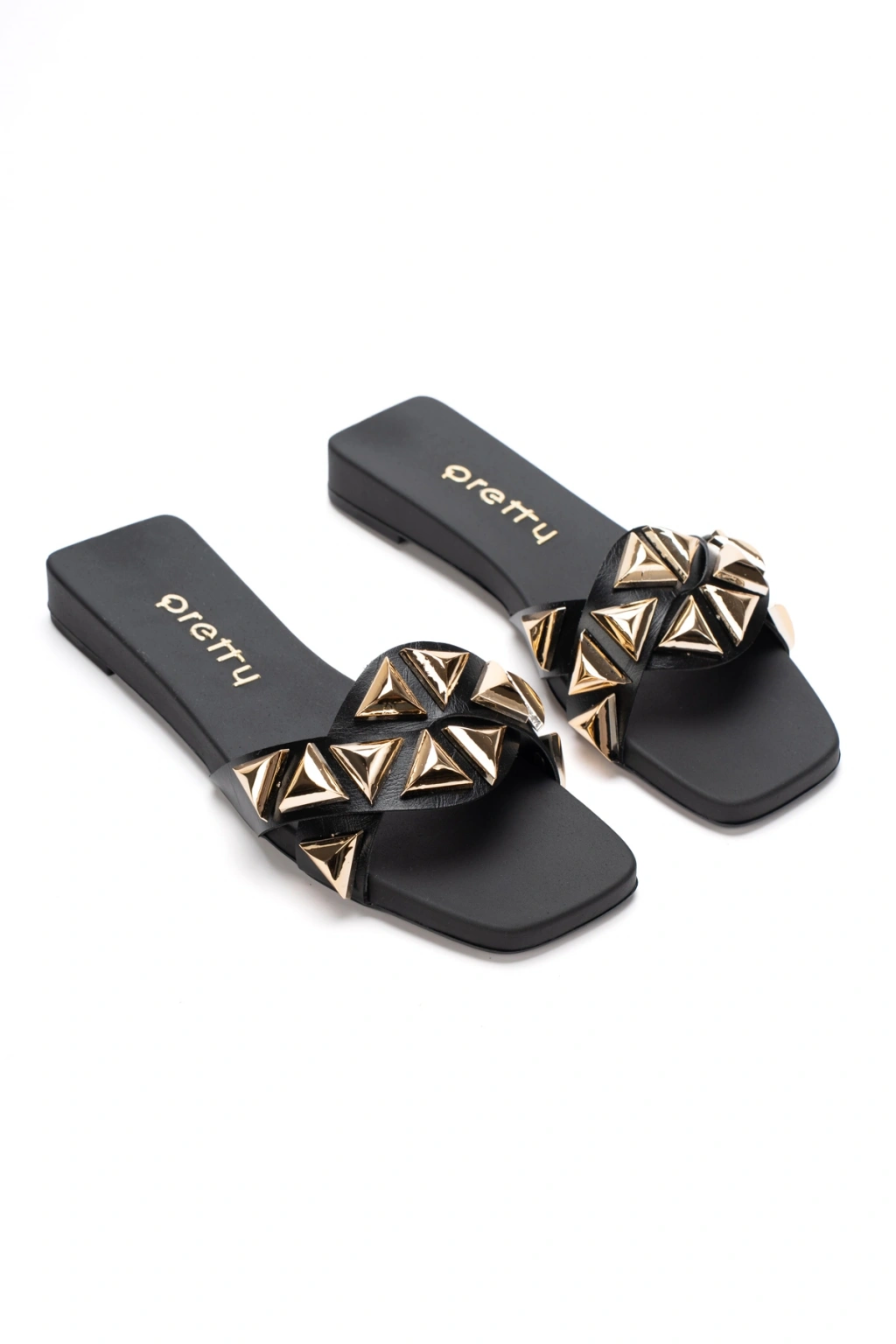 Kadın Siyah Tek Bantlı Gold Aksesuarlı Terlik