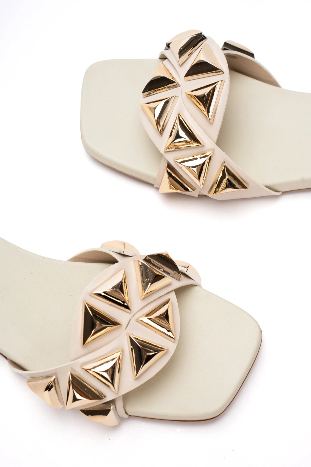Kadın Bej Tek Bantlı Gold Aksesuarlı Terlik