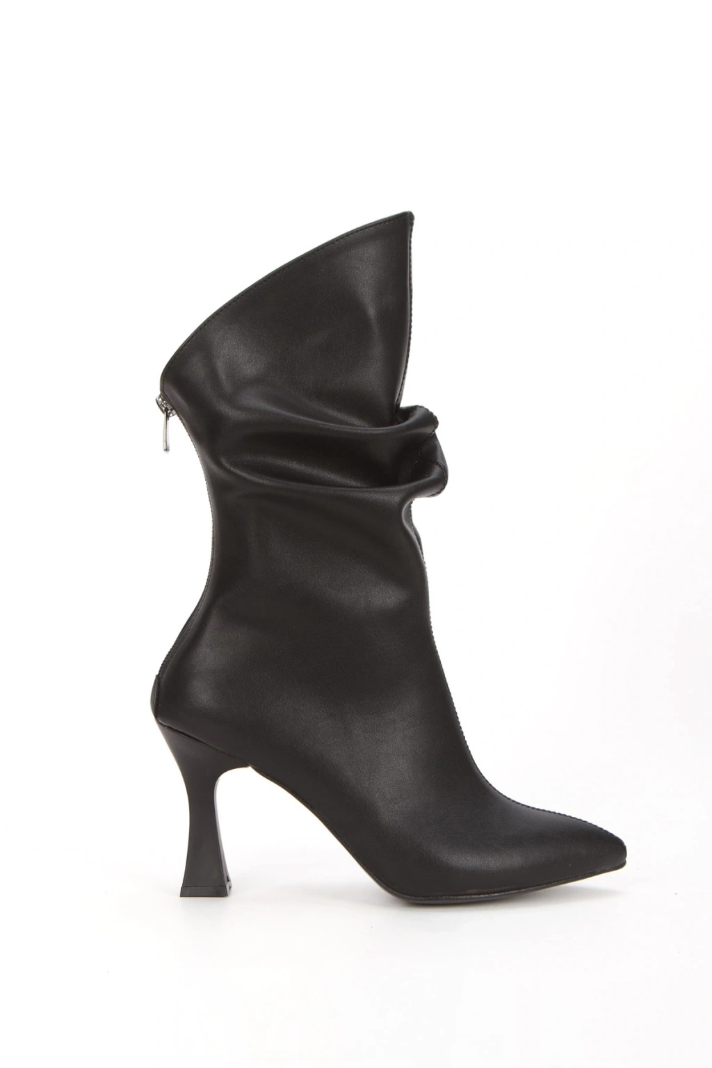 Kadın Siyah Özel Tasarım İnce Topuklu Büzgülü Fermuarlı Bot