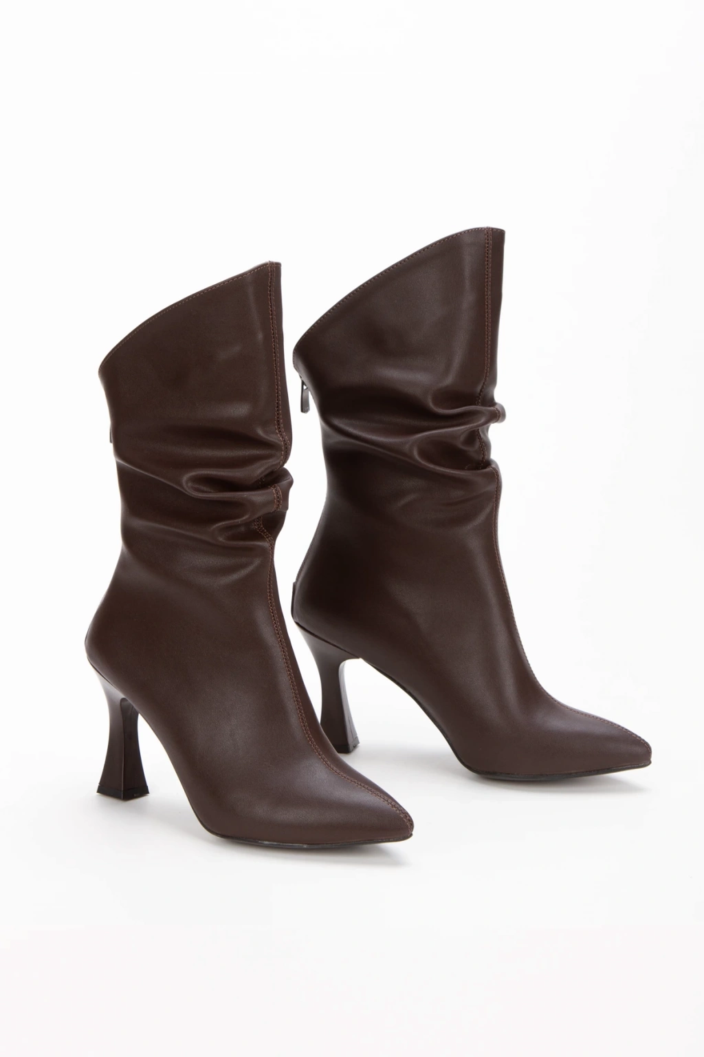 Kadın Kahverengi Özel Tasarım İnce Topuklu Büzgülü Fermuarlı Bot
