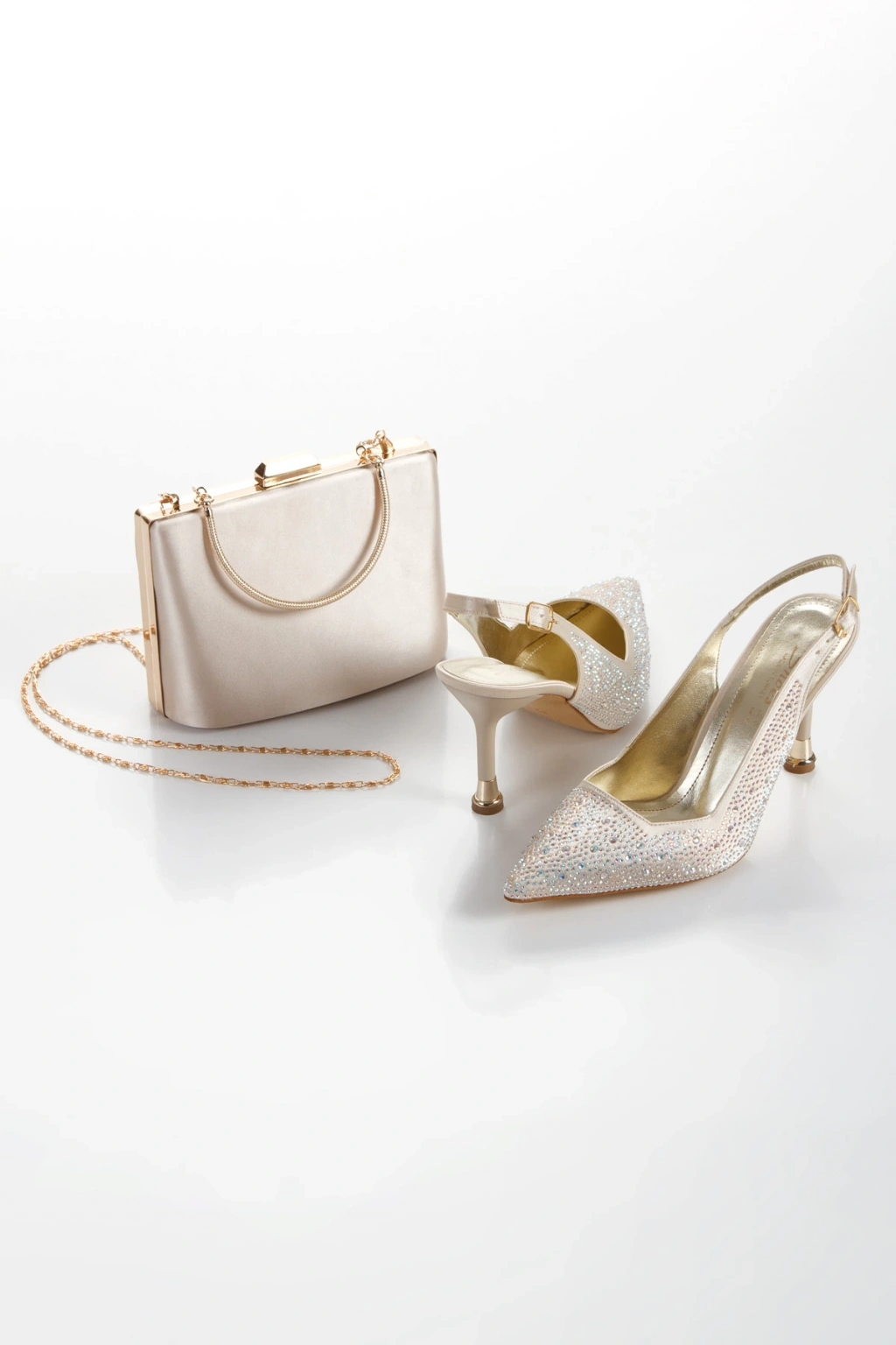 Ten Taşlı Özel Davetlere Uygun Şık İnce Topuklu Ayakkabı ve Çanta Takımı