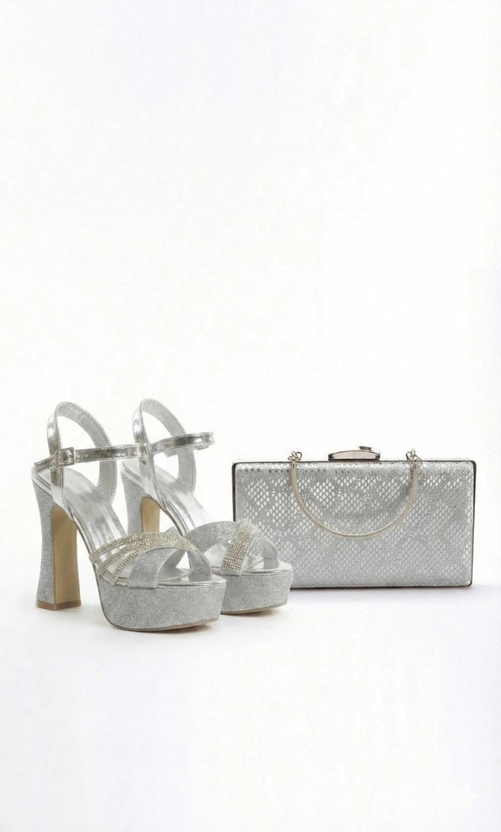 Kadın Taşlı Platformlu Abiye Ayakkabı ve Çanta Takımı Gümüş