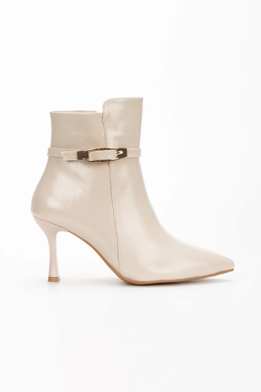 Bej Hakiki Deri Görünümlü Sivri Burunlu İnce Topuklu Tokalı Bot