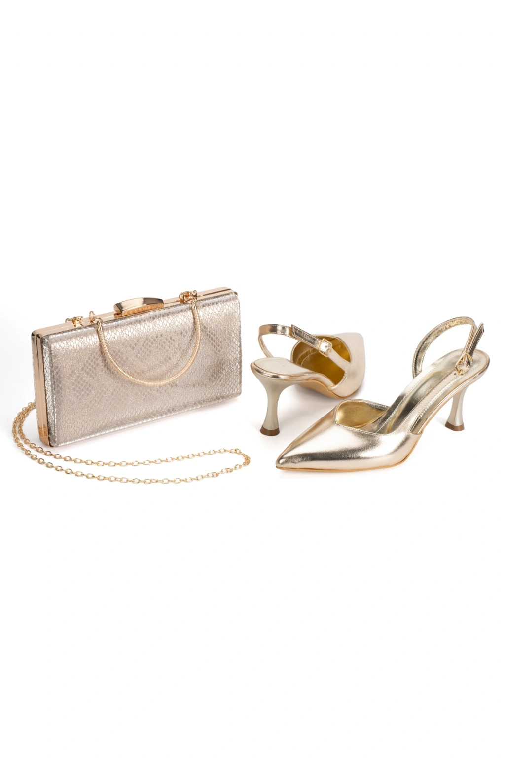 Kadın Sivri Burunlu Altın Ayna Stiletto ve Çanta Kombini