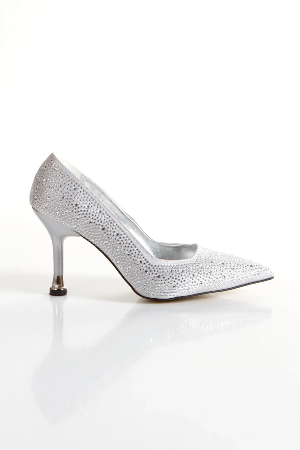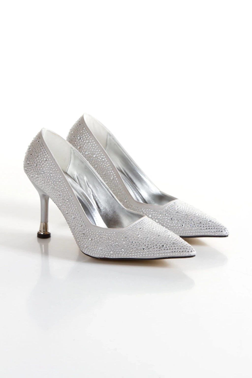 Gümüş Taşlı Özel Davetlere Uygun Şık İnce Topuklu Ayakkabı ve Çanta Takımı